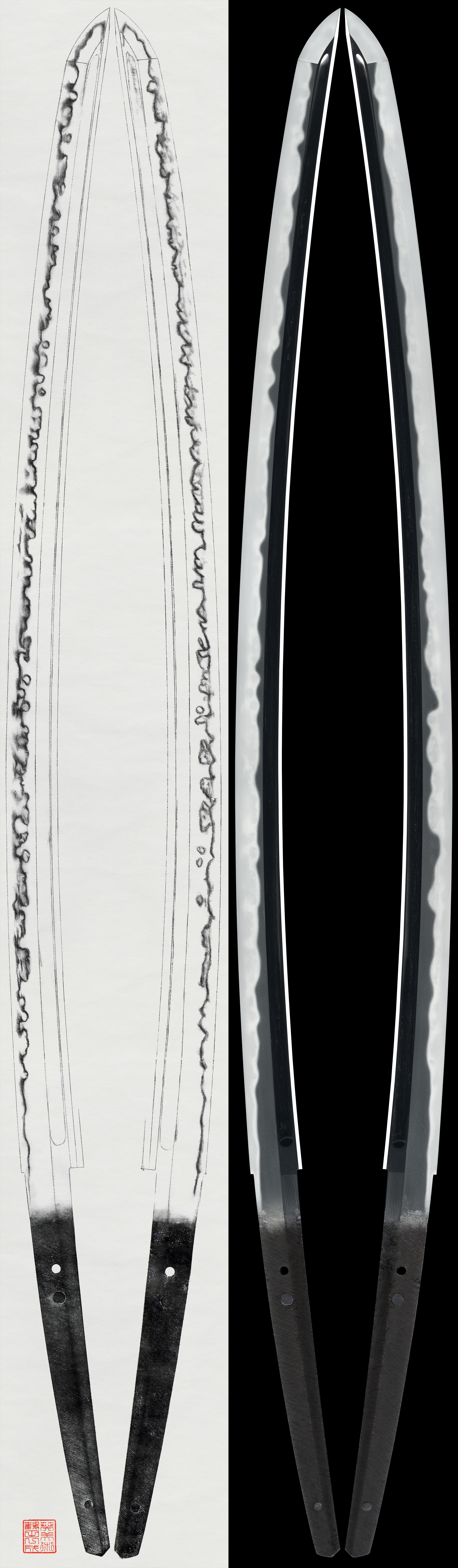 Shape: The blade is wide, thick in kasane, with an extended kissaki, and features a bo-hi (groove).