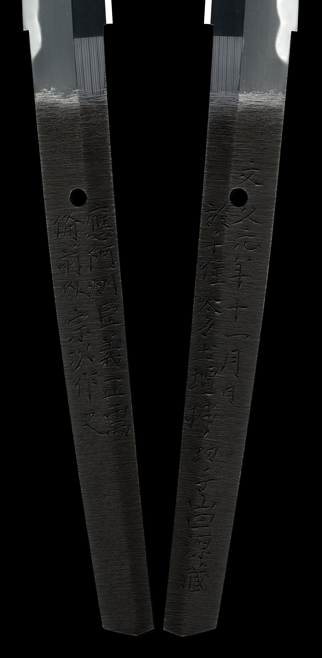 In the late Edo period, gold inlays were rarely used, and instead inscriptions were carved directly onto the tang (nakago).