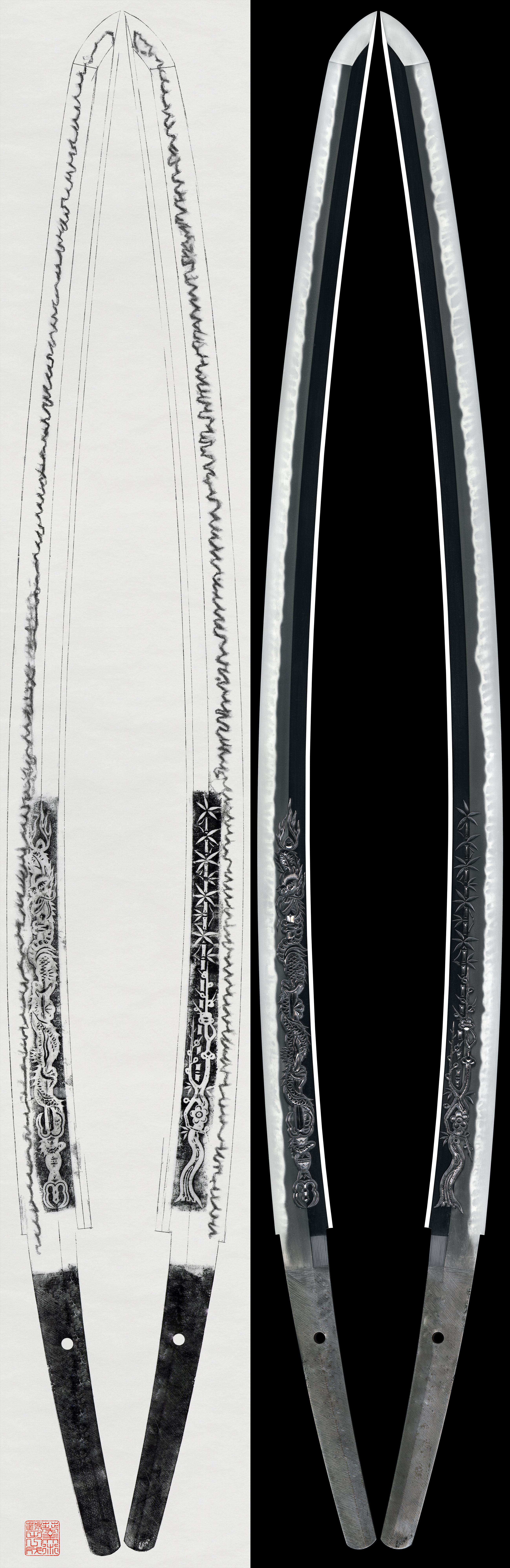 On the omote, the smith carved a dragon by himself, and on the ura he carved plum blossoms and bamboo.