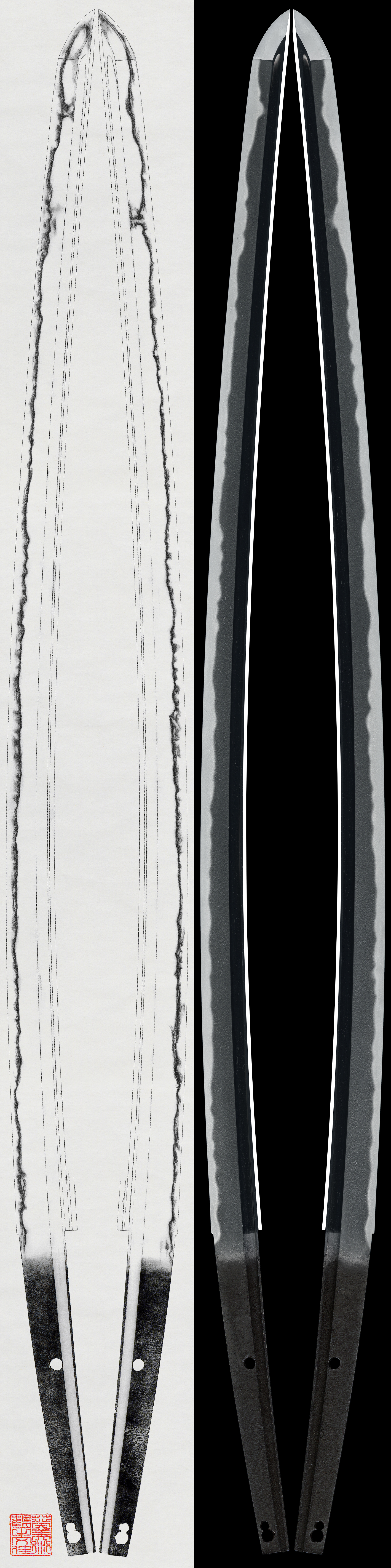Hamon: Based on notare, mixed with gunome-midare and ko-gunome-midare. The nioiguchi is deep, with well-defined ko-ashi. Sunagashi and yubashiri are present.