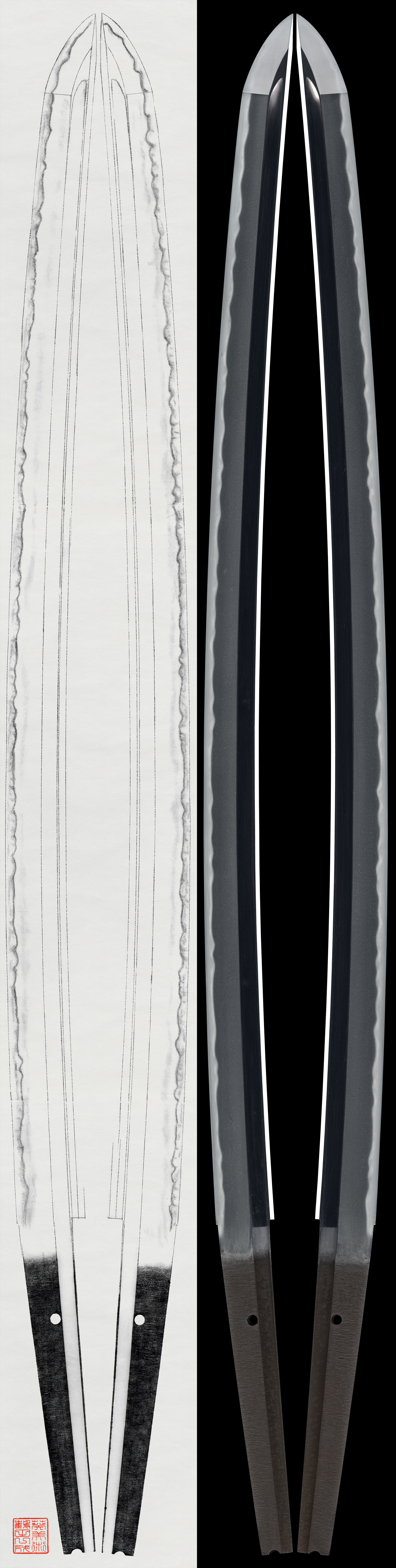 Extant works are few, including tanto, wakizashi, and tachi, and it is said that the hamon often shows small patterns.