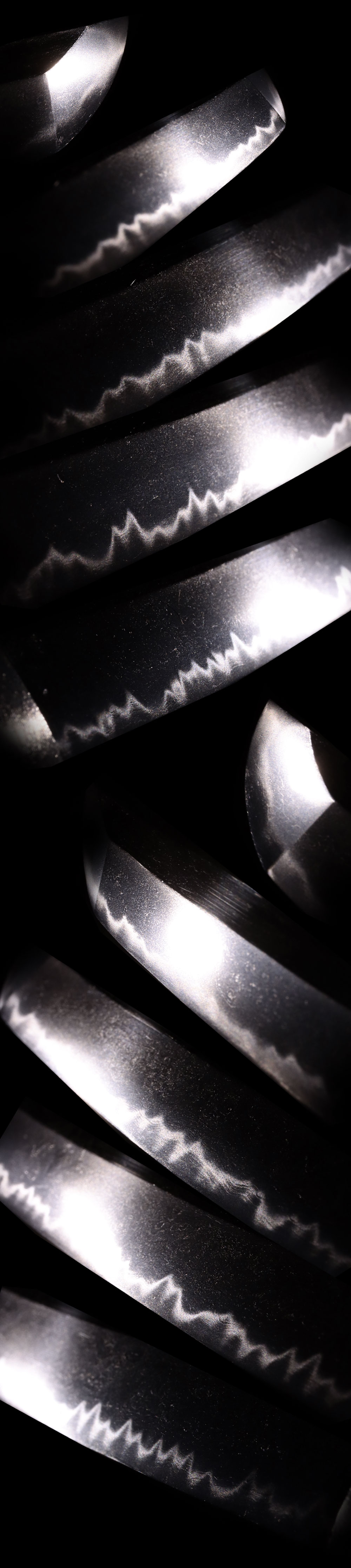 Hamon: Niedeki Togari(pointed)-gunomemidare with Ashi and Sunagashi kinsuji.