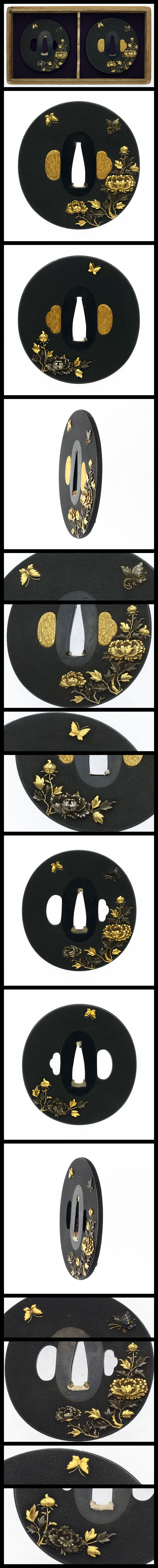 Special Feature: Boldly carved peonies and butterflies on a shakudō nanako ground, adorned with gorgeous inlaid polychrome decoration.