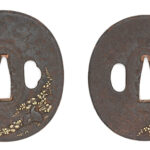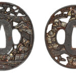 Features: Mokko-shaped iron tsuba with openwork and brass inlay.