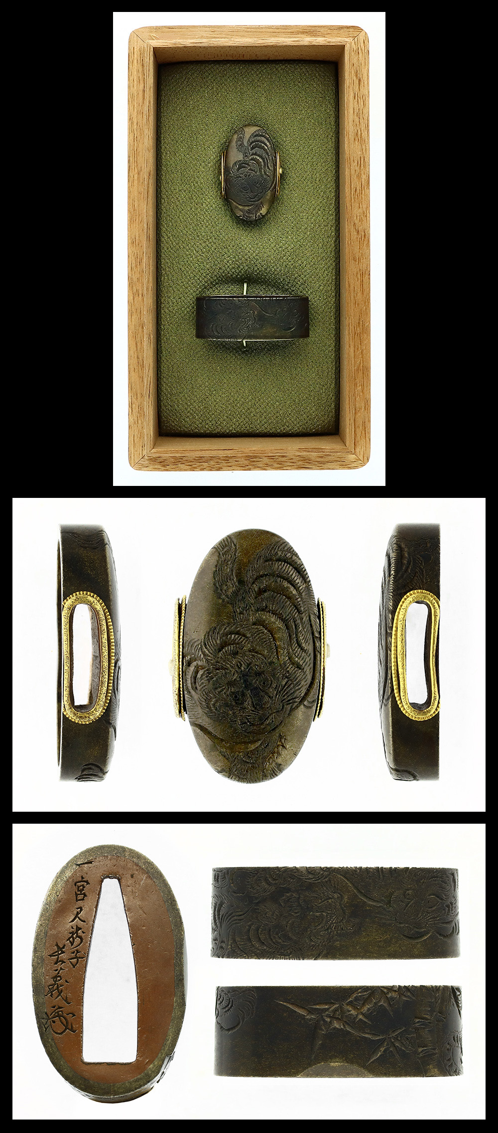 Special Feature: Fuchi-kashira with a design of bamboo and tiger carved on a smooth shibuichi base. Ichinomiya Nagayoshi was a mid-Edo period metalworker who was active in Kyoto and Osaka.