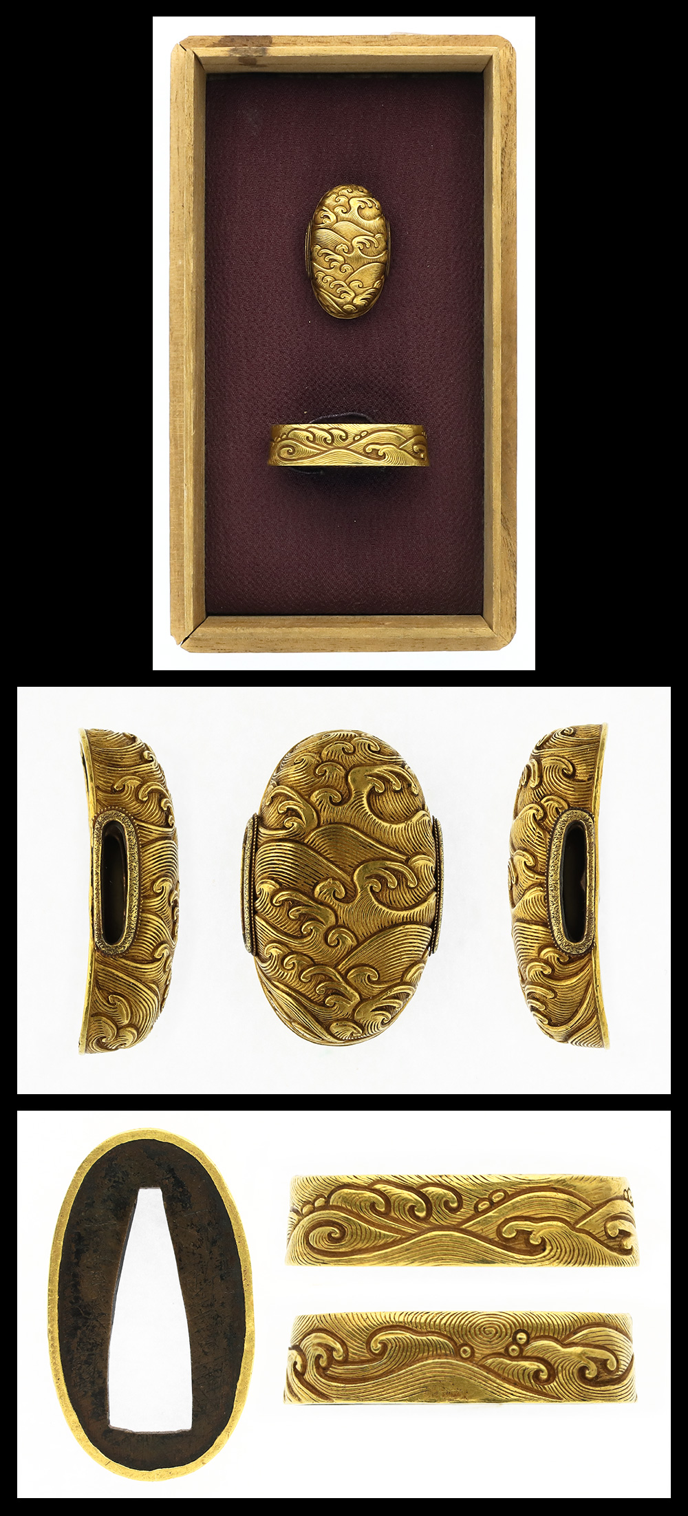 Carved wave design on a shakudō ground, finished with gold overlay. This set would make an striking addition when mounted on a koshirae.