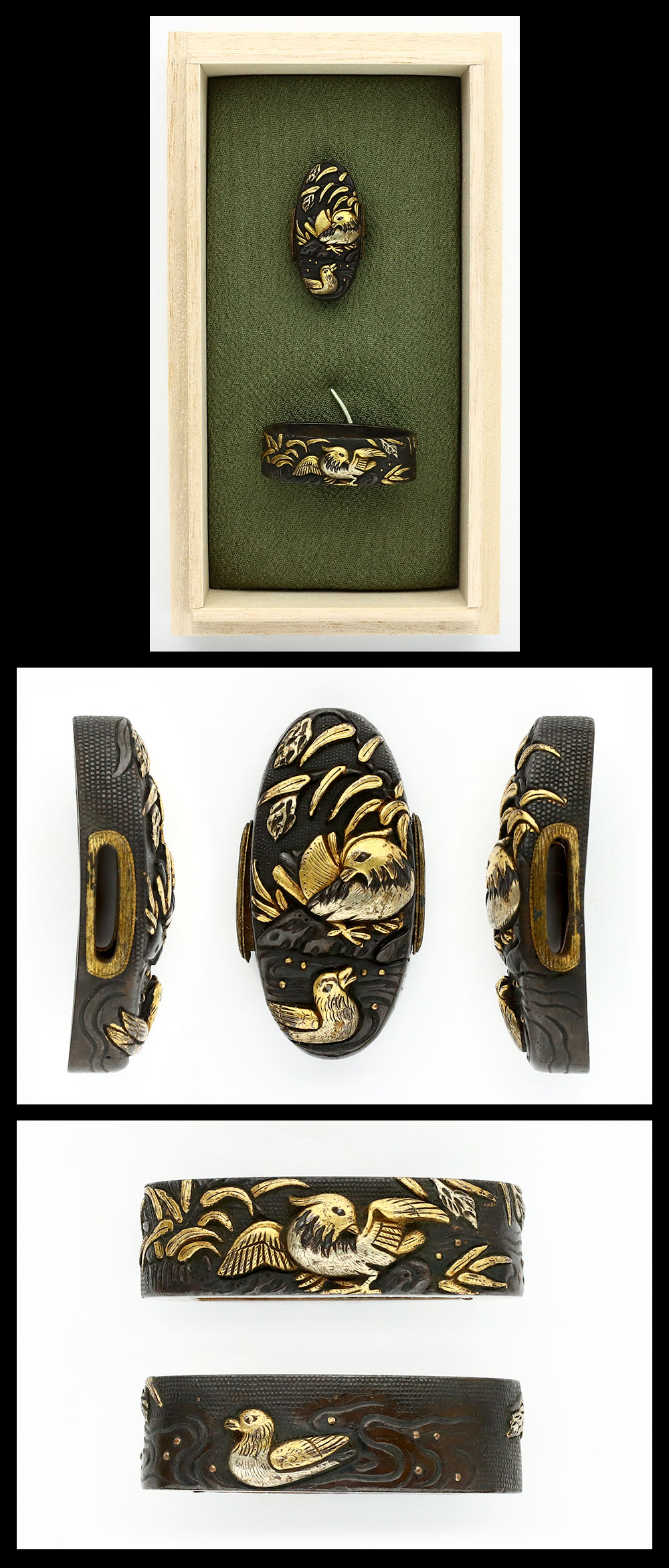 Special Feature: On the Shakudo nanako base, wild geese are engraved and colored with gold.