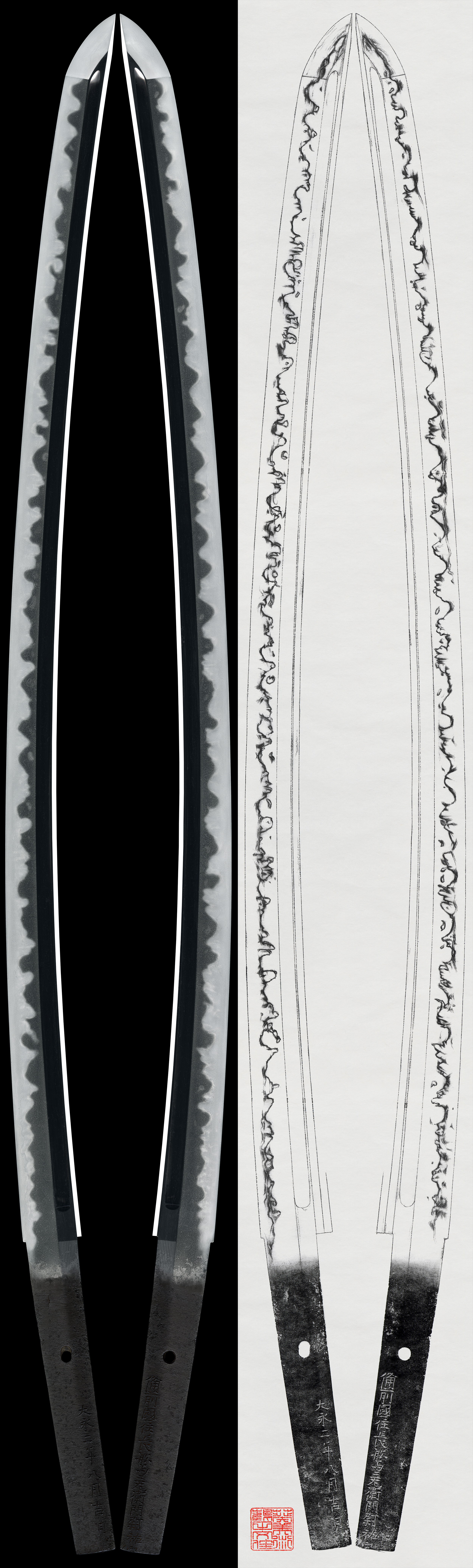 Wide-bodied with thick kasane, carved bohi on both sides, deep curvature, and extended kissaki, forming an excellent overall shape.