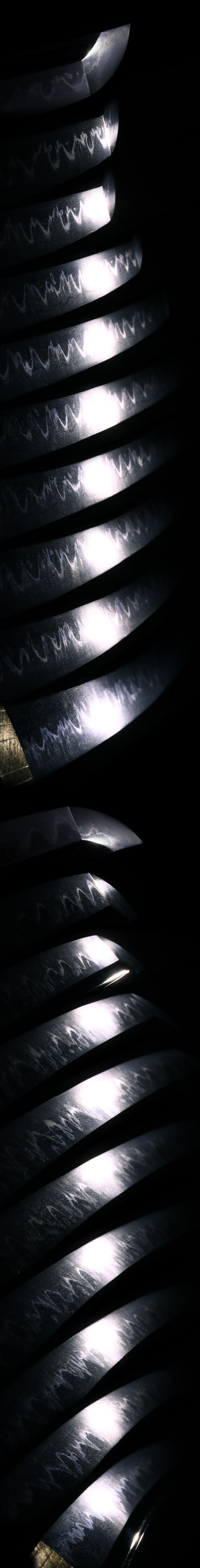 This blade is signed Bizen Kuni Ju Osafune Yosanzaemon no Jo Sukesada with a long 14-character inscription that includes the date Daiei 2 (1522). The blade is Ubu, and the tang tip is finished in a tsumami (pinched) style.It bears a tachi-mei,indicating it seemes it was specially commissioned for use as a jin-tachi.The blade shows a powerful shape with a wide mihaba deep curvature, and an elegant saki-zori .The well-forged itame-hada is refined and displays utsuri.The hamon consists of large gunome mixed with small gunome and pointed togari-ba, forming a complex and dynamic midare pattern with tobiyaki .This results in an exceptionally active and dramatic hamon, surpassing even the usual beauty of Sukesada’s works.It is considered one of the finest examples.