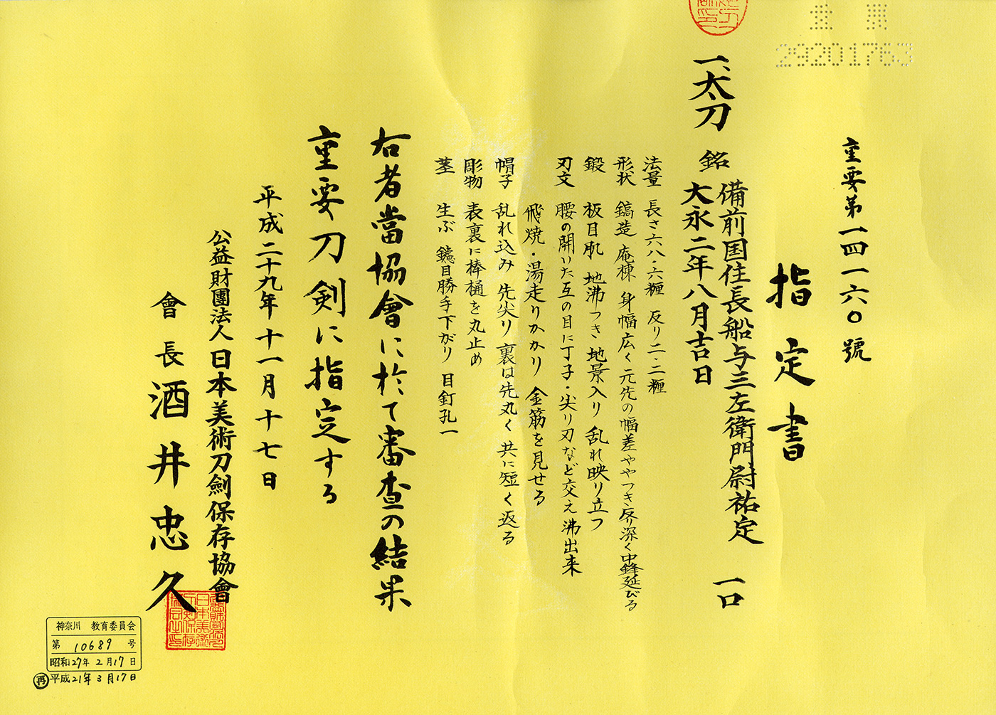 Signature: Bizen Kuni Ju Osafune Yosazaemon no Jo Sukesada
