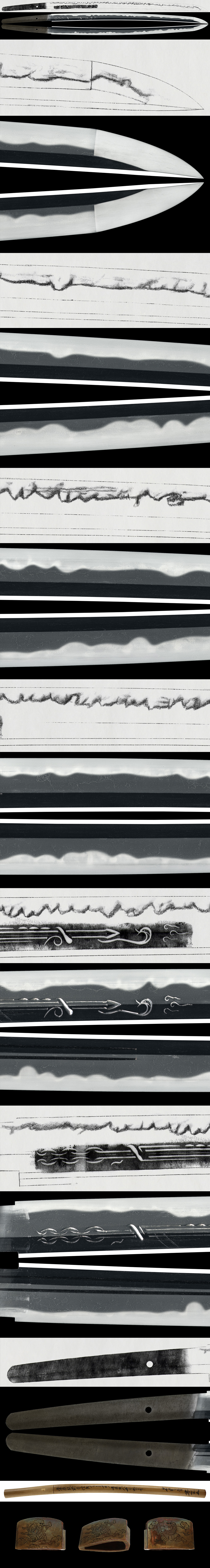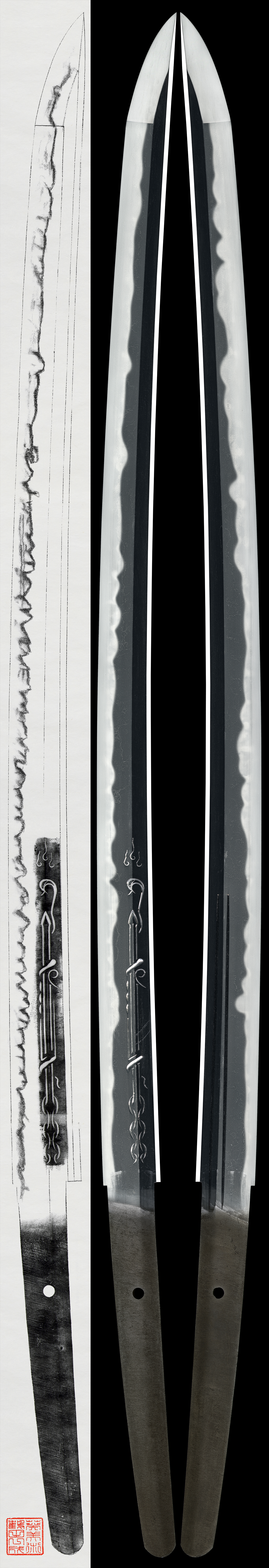 Shape:The blade has a solid width, with bo-hi grooves carved about one-third on both sides, and a kenmaki-ryu carving on the ura side, featuring a long boshi and a well-balanced shape.