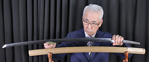 Features: This blade is judged to have a gimei (false signature). However, the overall shape is good, and at first glance the fine masame-hada brings to mind the work of Tokukatsu of the Shinshinto period. The blade has a deep curvature, and the jihada is tightly forged with masame appearing in places.