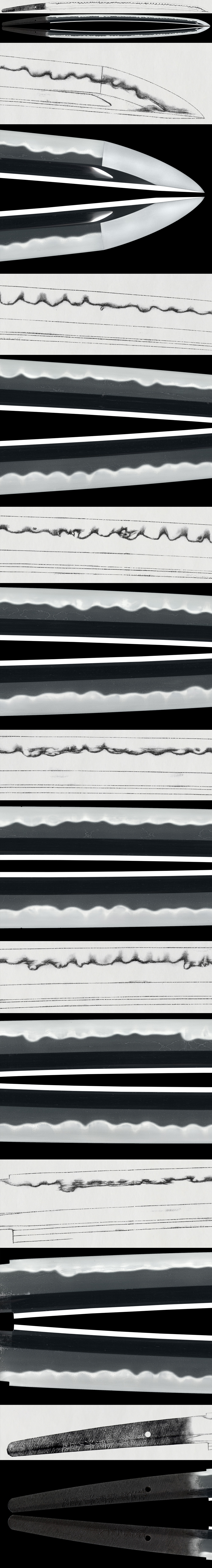 Hamon: Gunome-midare with a slightly rounded appearance; the boshi is midare-komi in the style reminiscent of his master Kiyomaro.