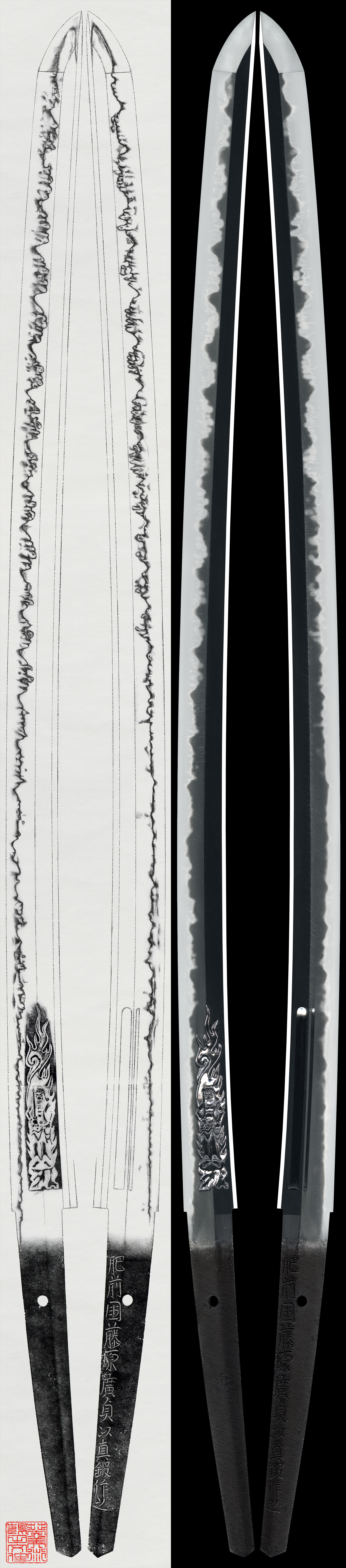 This blade exhibits the characteristic tight and bright jigane typical of Hizen swords. The hamon is particularly noteworthy, featuring a fine gunome-choji pattern with abundant ashi and yo working throughout, resulting in a rare and highly attractive temper line. Although the carving is likely a later addition, it leaves a strong and impressive presence.
