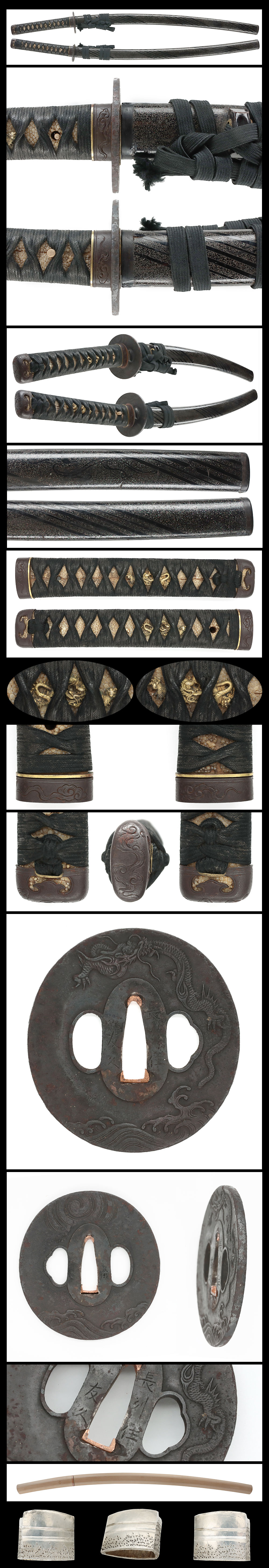 Menuki: Dragon design carved and colored with gold.