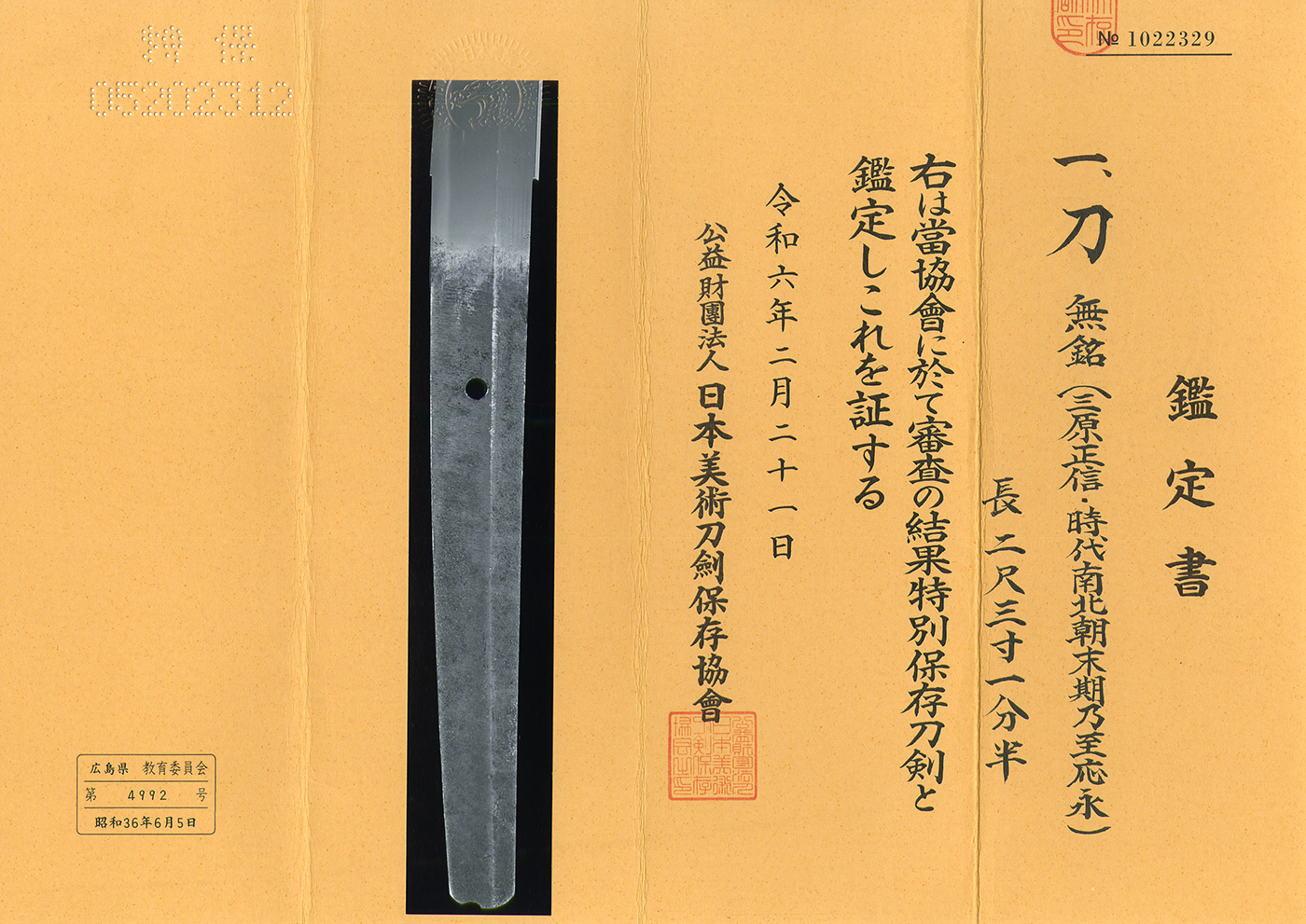 Signature: Mumei (Mihara Masanobu, late Nanbokucho to Oei period)
