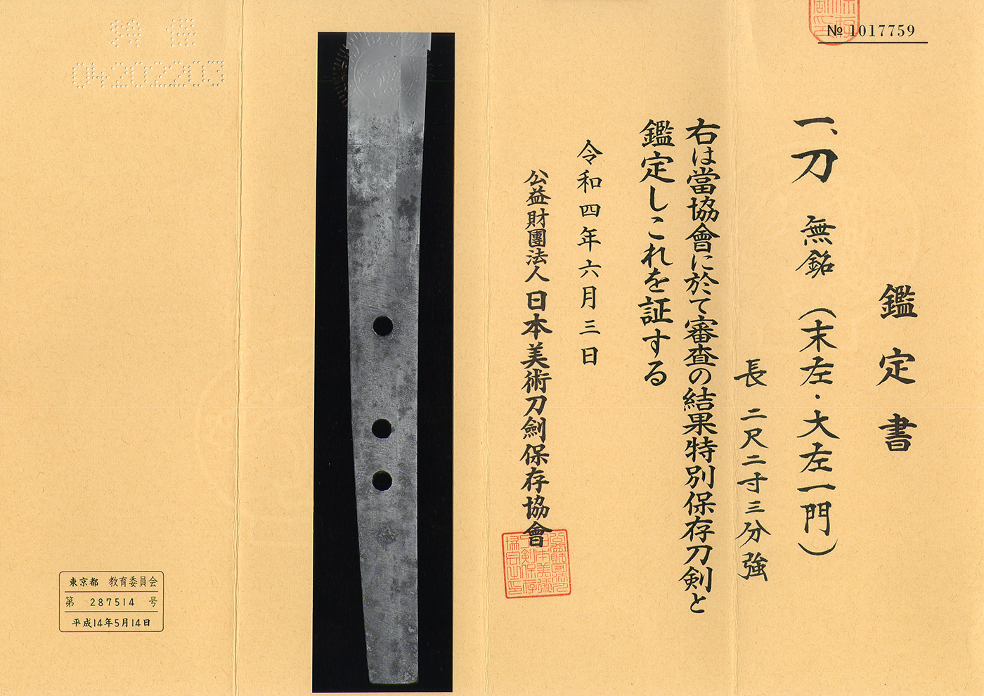 Katana: In Shirasaya (NBTHK Tokubetsu Hozon Token)