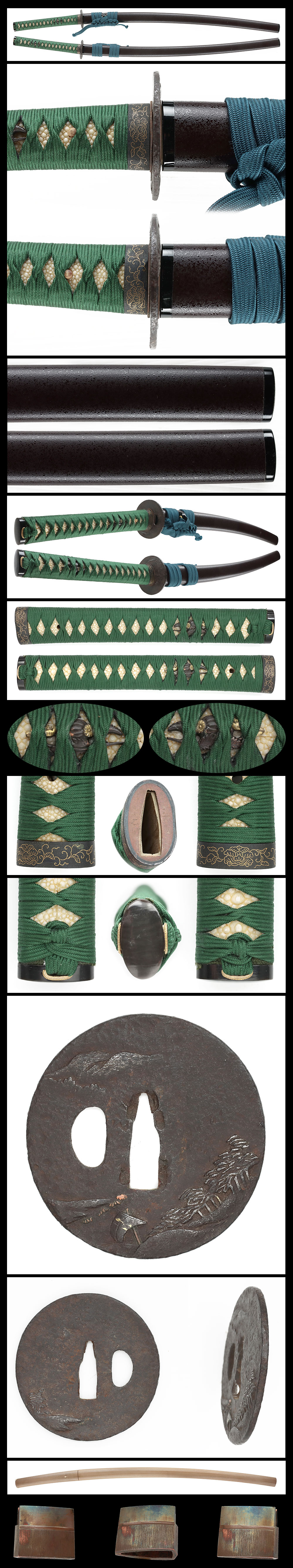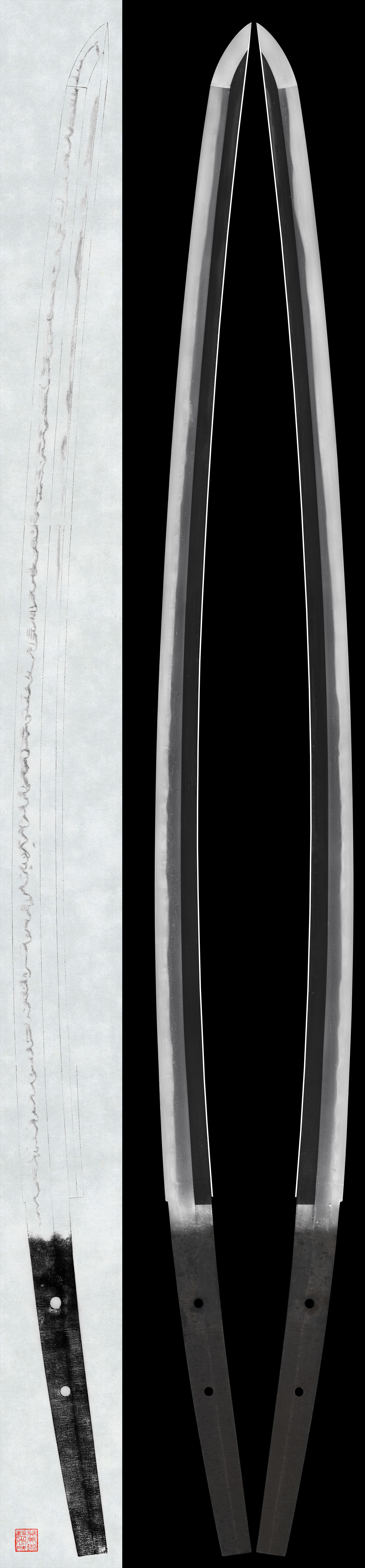 Shape: Wide blade, suriage (shortened), with deep curvature and an extended kissaki, forming a well-balanced shape.