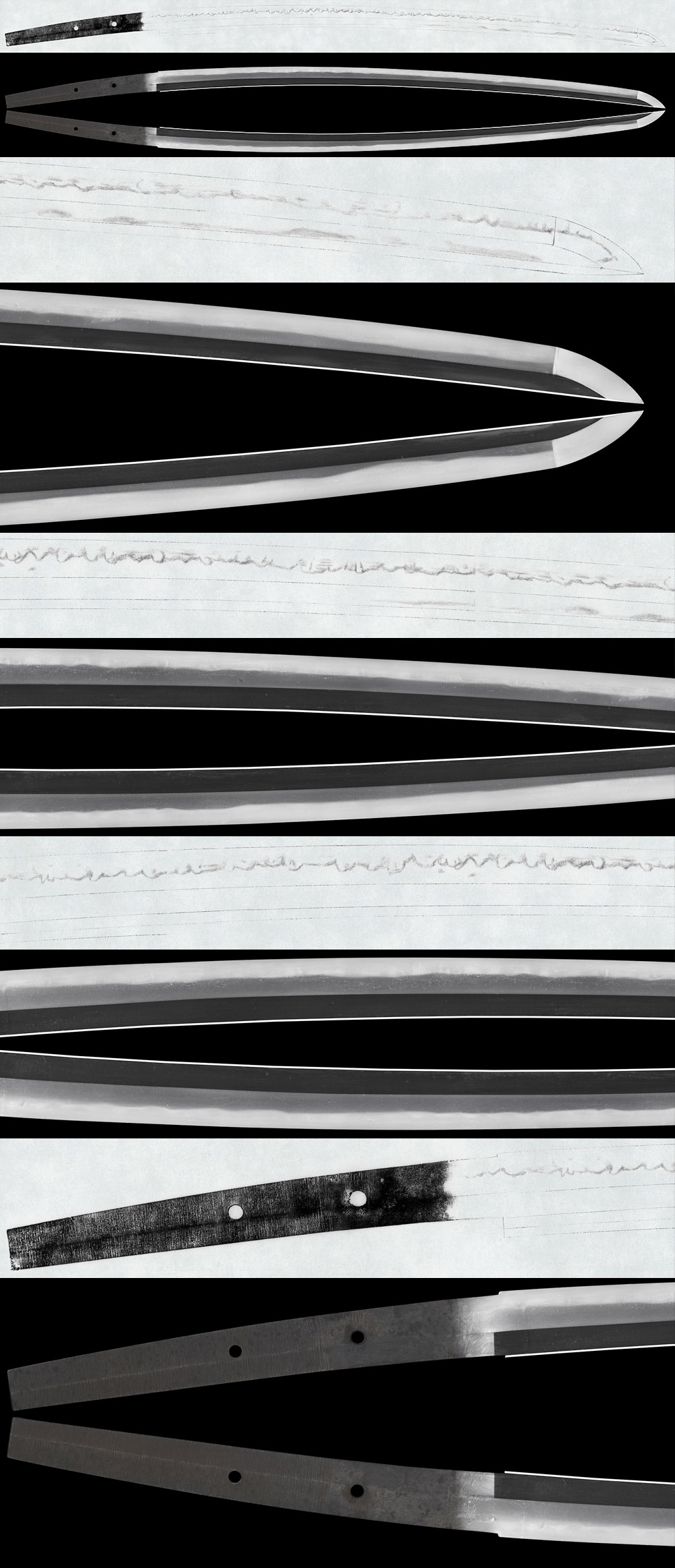 Hamon: Nie-deki, gunome-midare with well-defined ashi, containing sunagashi and kinsuji.