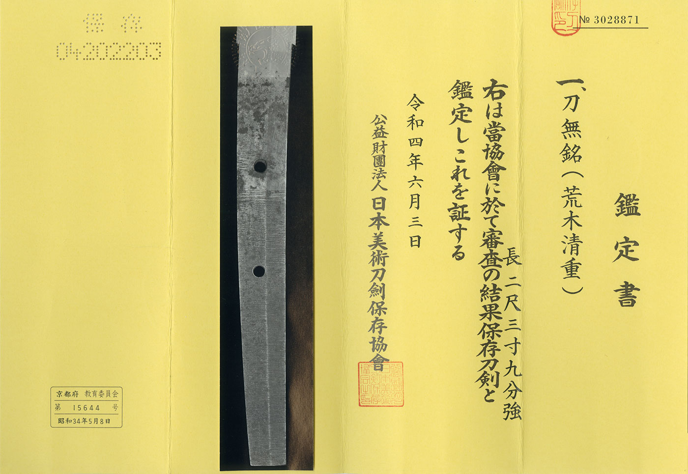 Features: Although the curvature suggests an older appearance, the jigane is relatively fresh, and the sword was attributed to Araki Kiyoshige by the Sword Museum.