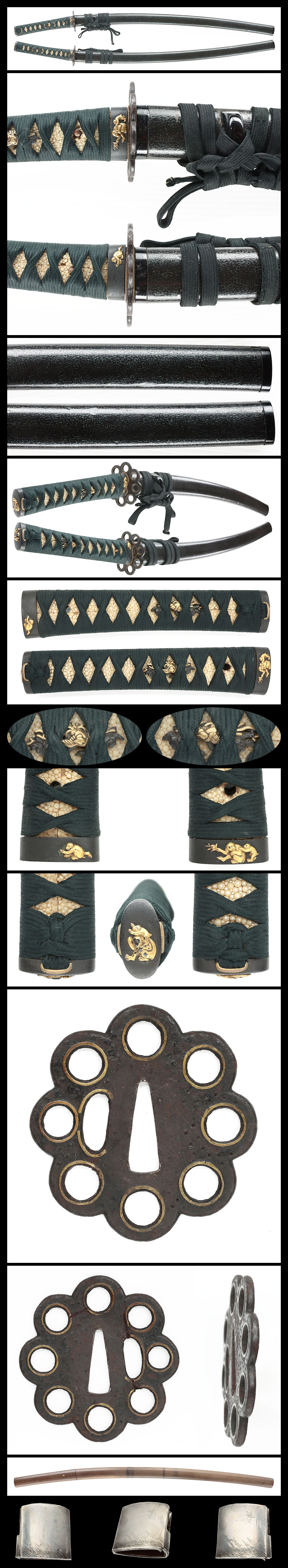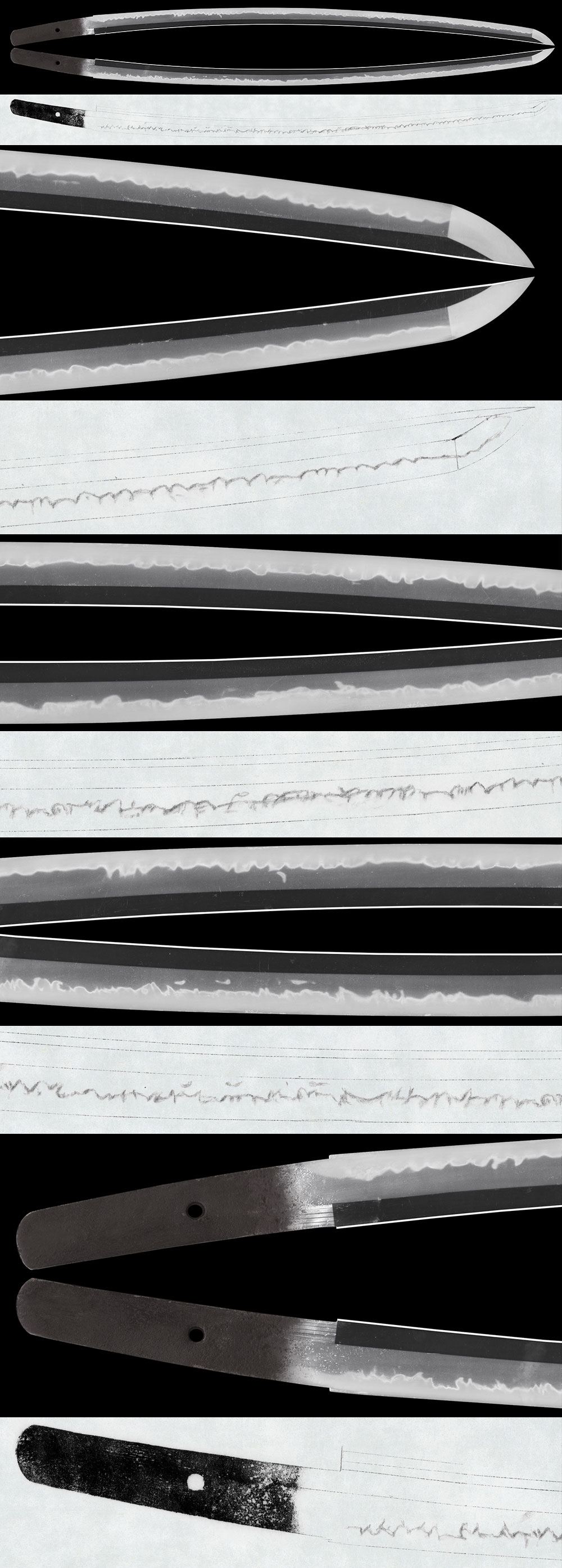 Features: Fujiwara Takada refers to swordsmiths from Bungo Takada who were active from the late Muromachi period to the early Edo period. While Takada works are often similar to Bizen blades, this piece as well features a flamboyant gunome-midare temper pattern. Compared to Bizen works, however, the jigane is more tightly forged, giving it a plain, muji(plain)-like appearance.