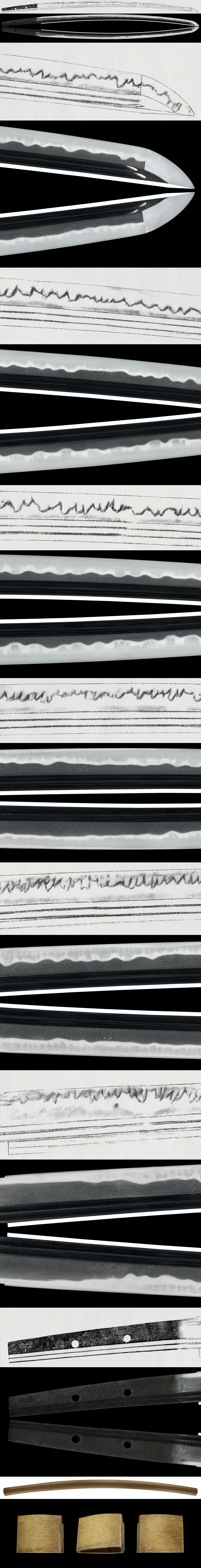 Hamon: Nie-based, with gunome-midare mixed with choji-midare. The temper line becomes irregular toward the kissaki, showing variation in height and forming a well-executed work.