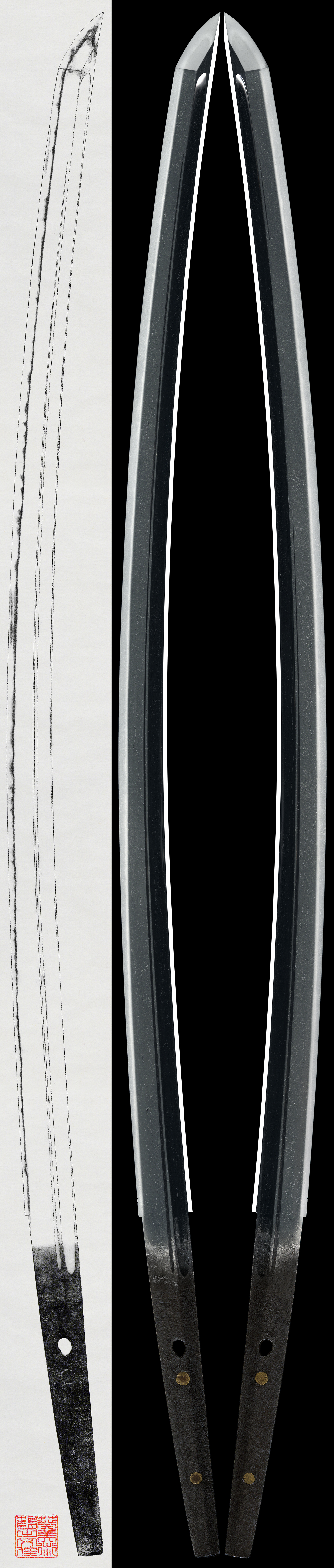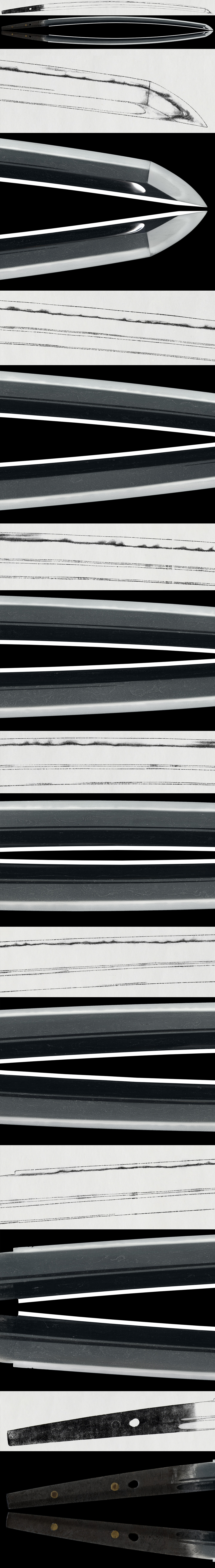 Shape: wide, thick Suriage Mumei blade with groove carvings.
