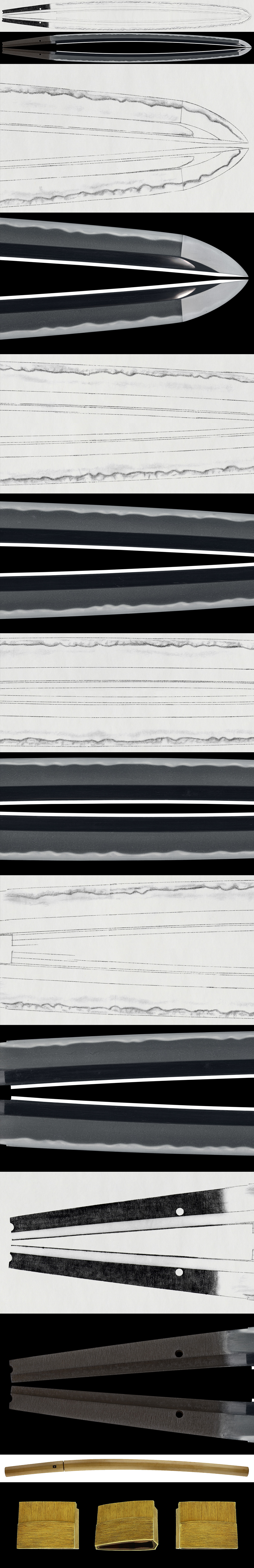 Hamon: Ko-nie deki Notare and Gunome. Boshi is Midare-komi with Kinsuji and ends in Yakizume style.