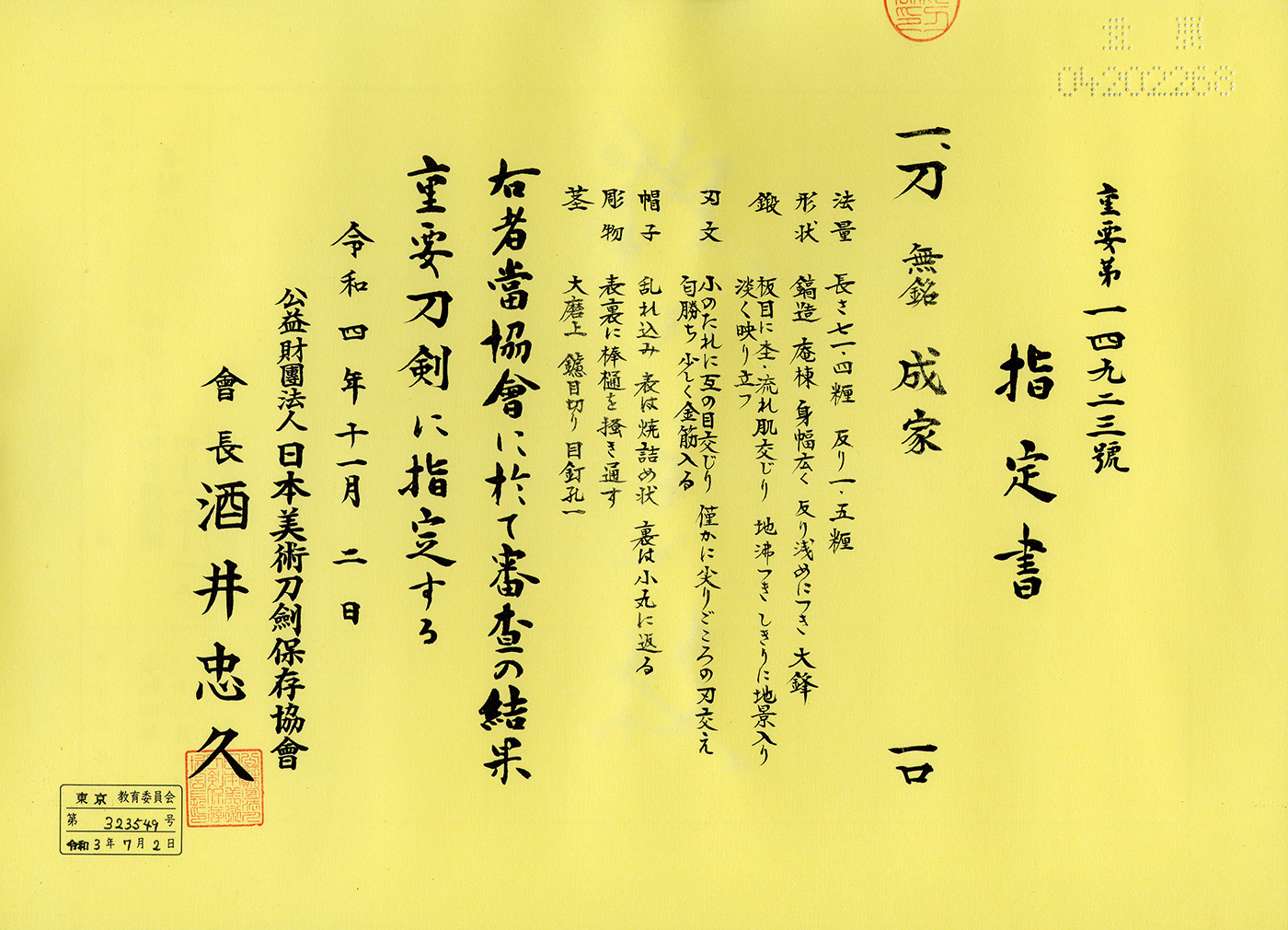 Katana: Mumei(Unsigned)(Nariie)(68th NBTHK Juyo Token)