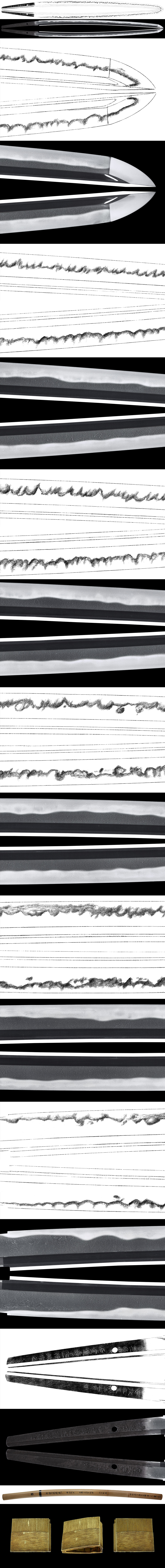 Hamon: Nie base, thick Gunome Midare and Choji Midare mixed with Sunagashi and Kinsuji.