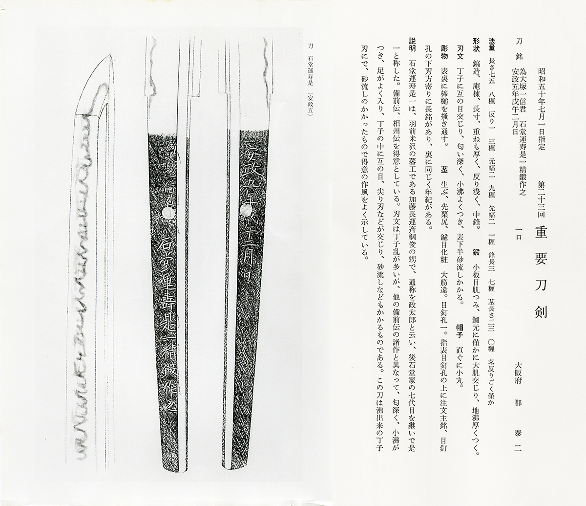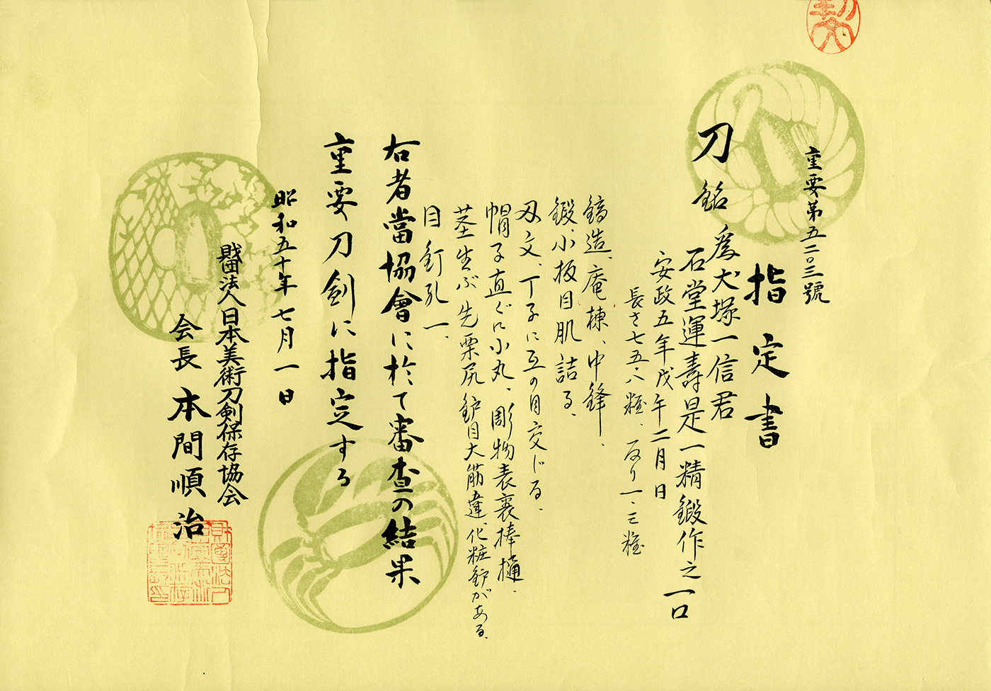 Sayagaki: Seikido Unju Korekazu Ansei Tsuchinoe-Uma, blade length 75.6cm, Showa Kinoto-U Satsuki (May 1975)