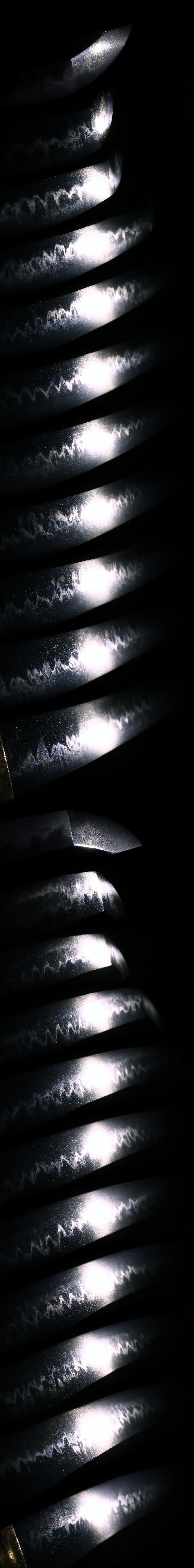 Aoi Art’s Comment: The choji-midare continues, becoming large and intensely midare near the kissaki, with the boshi also showing vigorous midare.