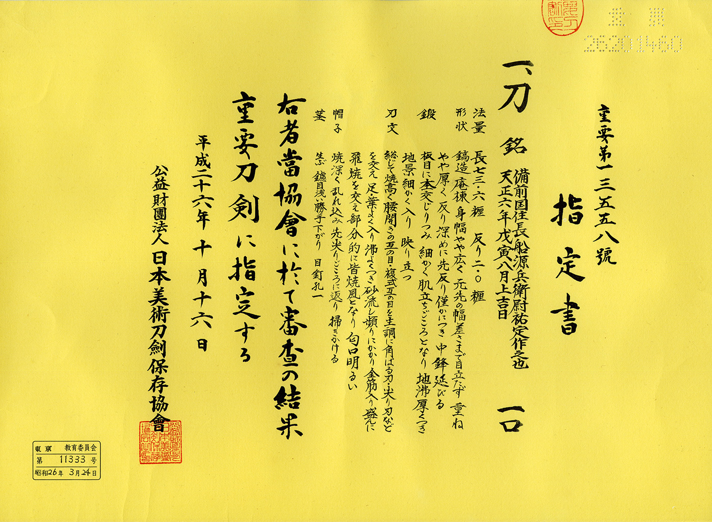 Katana:Bizen Koku Ju Osafune Genbei no Jo Sukesada Saku Kore. A lucky day in August, Tensho 6 (1578). (60th Juyo Token).