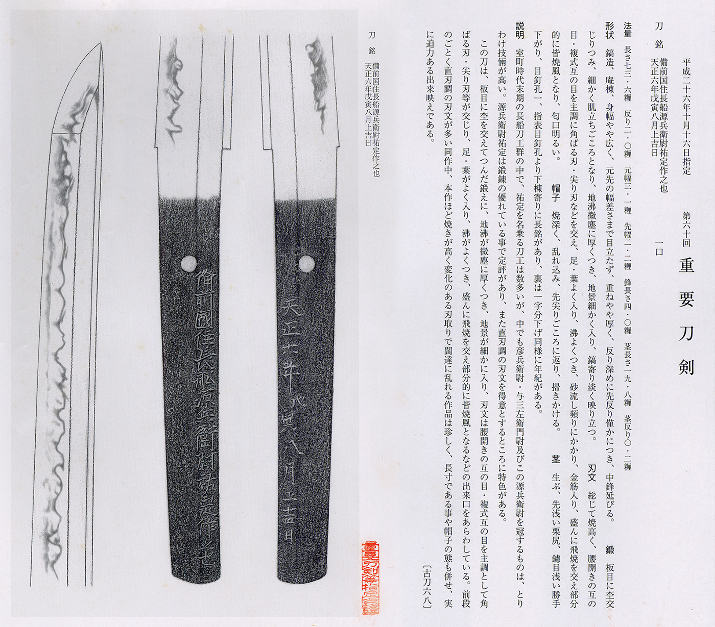 Shape: Wide mihaba with solid kasane, bearing a long inscription “Bizen no Kuni Ju Osafune Genbei no Jo Sukesada Saku Kore / A lucky day in August, Tensho 6 (1578)”.
