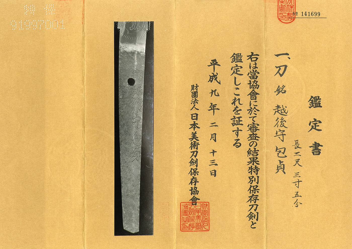 We divide 4 sections for each sword as Saijyo Saku, Jyojyo Saku, Jyo Saku, and Regular Saku. This piece is ranked as Jyojyo Saku for Echigo no Kami Kanesada.