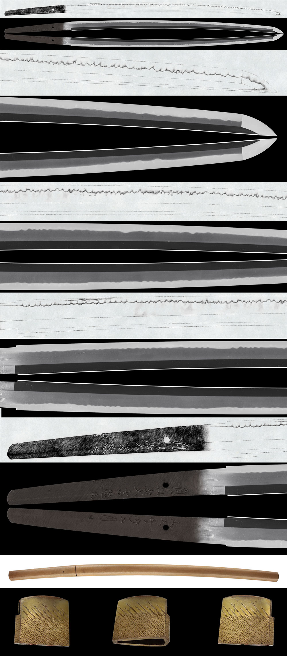 Hamon: Nioi-deki suguha with small ashi, with kinsuji working within the hamon. The boshi is midare-komi and returns in a rounded form.