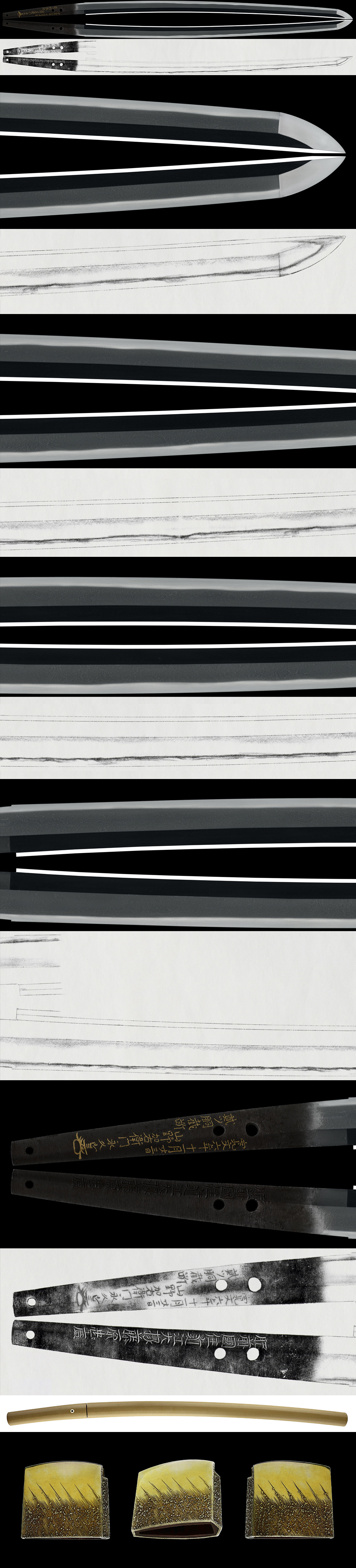From Aoi Art: this work has approx. 3cm Suriage Machiokuri. The Nakago has gold inlaid Saidanmei. It is rare to find Hizento with Saidanmei so this is an importance piece. Suguha with deep Nioikuchi has changes. The edge is soft. The blade is wonderfully