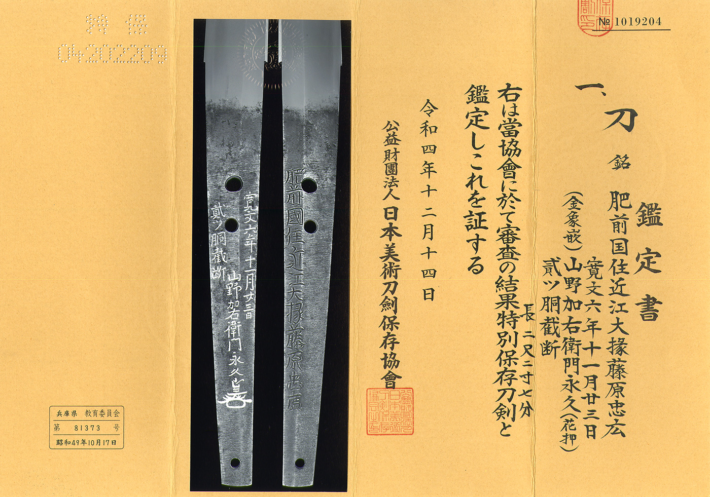 Katana:Hizen Koku Ju Omi Daijo Fujiwara Tadahiro(NBTHK Tokubetsu Hozon Token)