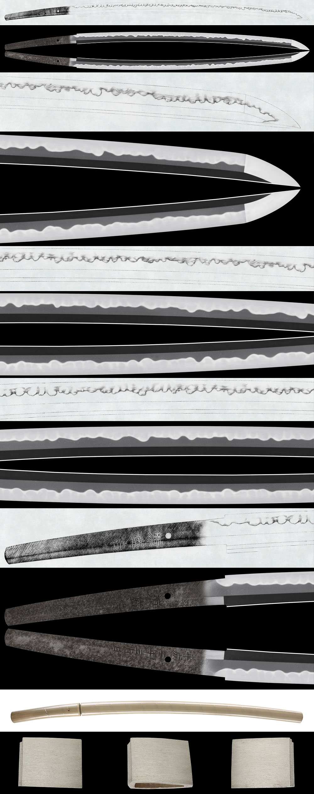 Hamon: Nie deki, gunome midare with a deep nioiguchi, the boshi is midarekomi and returns in a pointed manner.