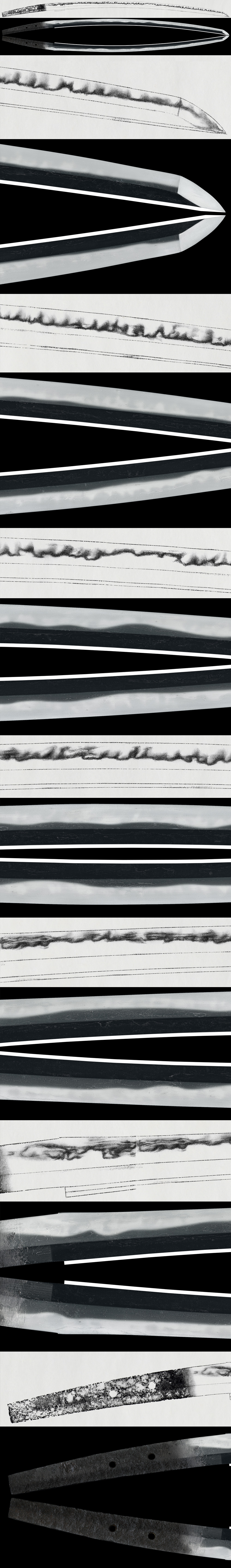 Hamon:A nioi-based gunome-midare pattern continues throughout, with prominent kinsuji and small ashi.