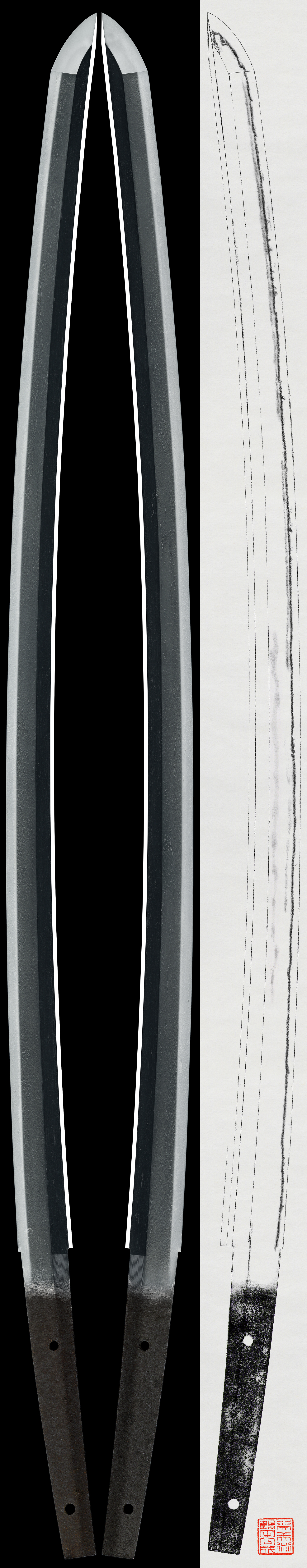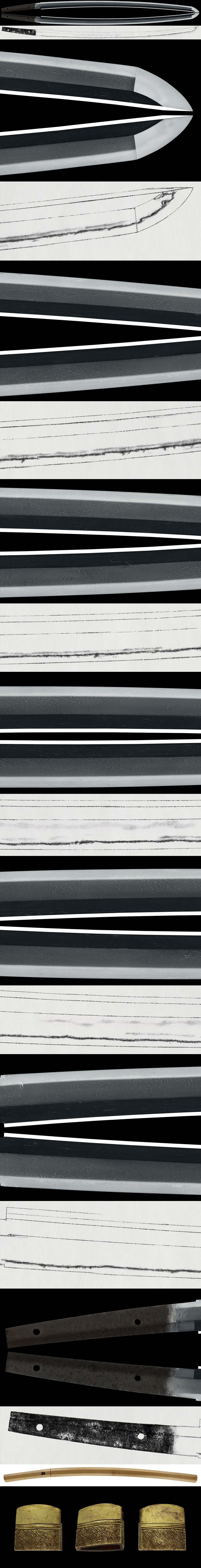 Shape: Suriage with the machi moved up, slightly deep curvature, and an extended kissaki.