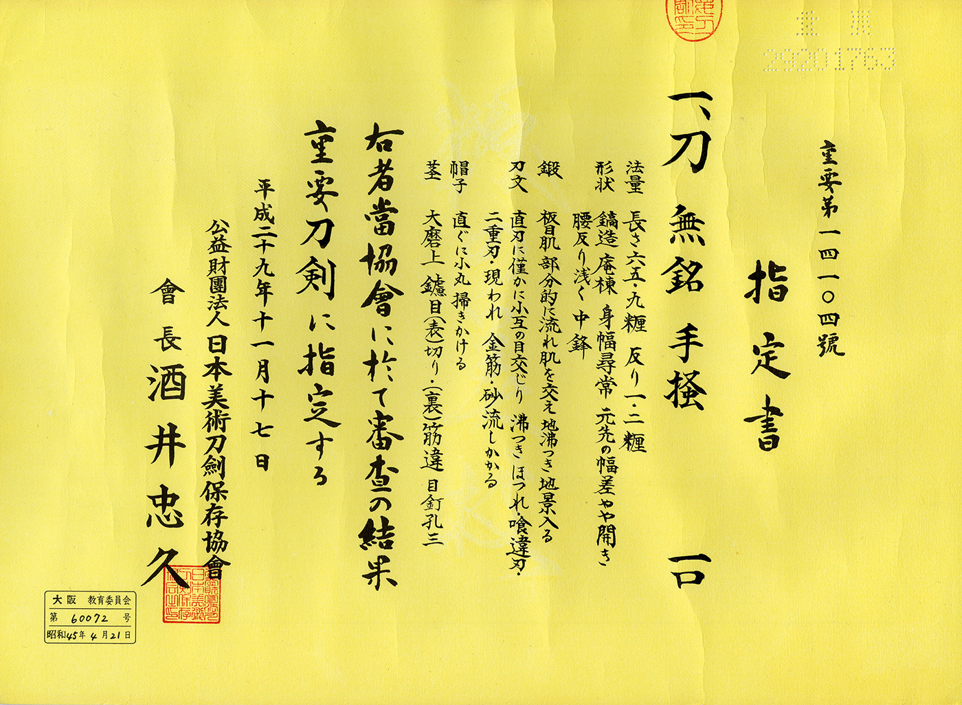 Katana:Mumei(Unsigned)(Tegai school 手掻) (the 22th NBTHK Juyo Token)