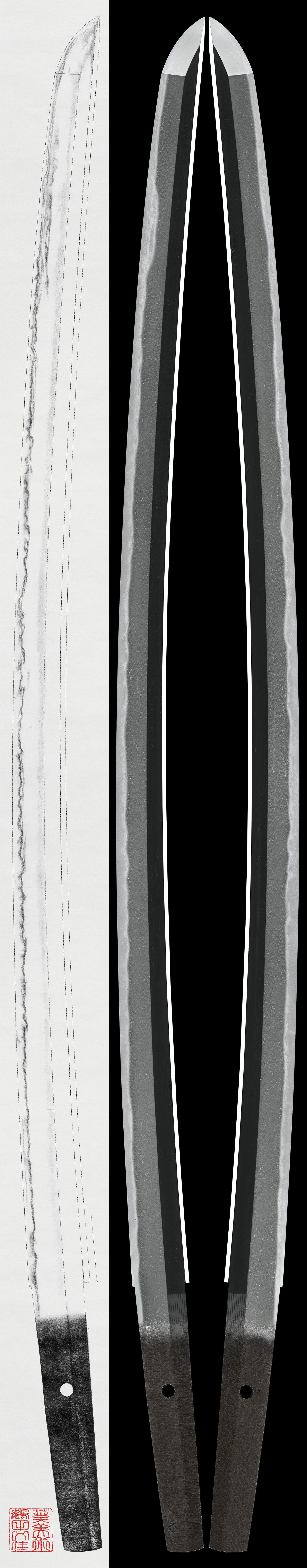 Shape: The blade has a solid width and thickness, with an extended kissaki.