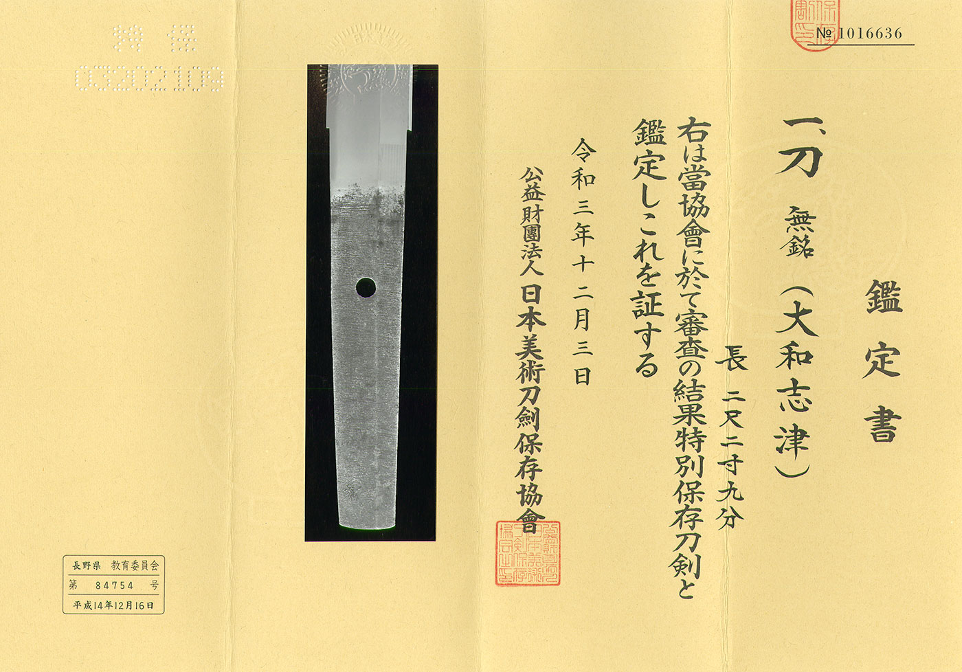 The hamon retains the typical characteristics of Yamato Shizu and possesses the dignity of a classical koto blade.