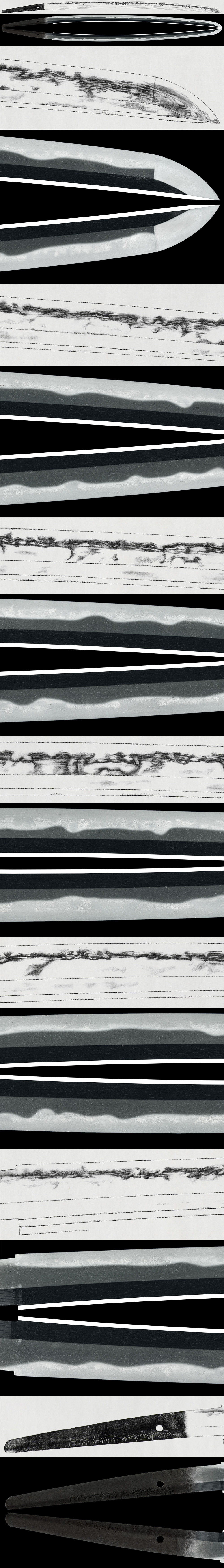 Hamon: Nie-deki gunome-midare, with a somewhat hard impression in the temper pattern.