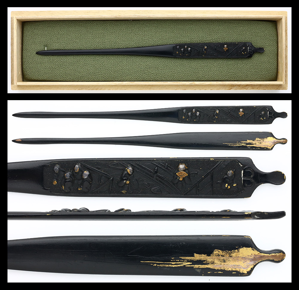 Special feature: Shakudo Nanako plate, people and landscape are engraved with gold color.