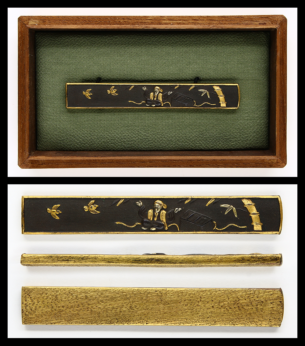 Special Feature: On the Shakudo Nanako plate, the story of Shita-kiri Suzume is engraved with gold color.