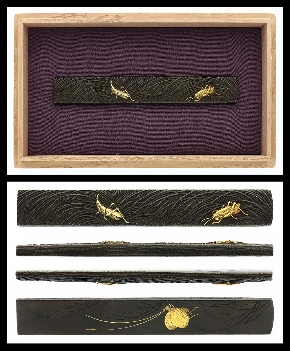 Features: Sukidashi-takabori (shallow carving in high relief) with iroe (colored metal inlay) design of thin autumn grasses and insects on a shibuichi ishime-ji (stone-textured shibuichi surface).