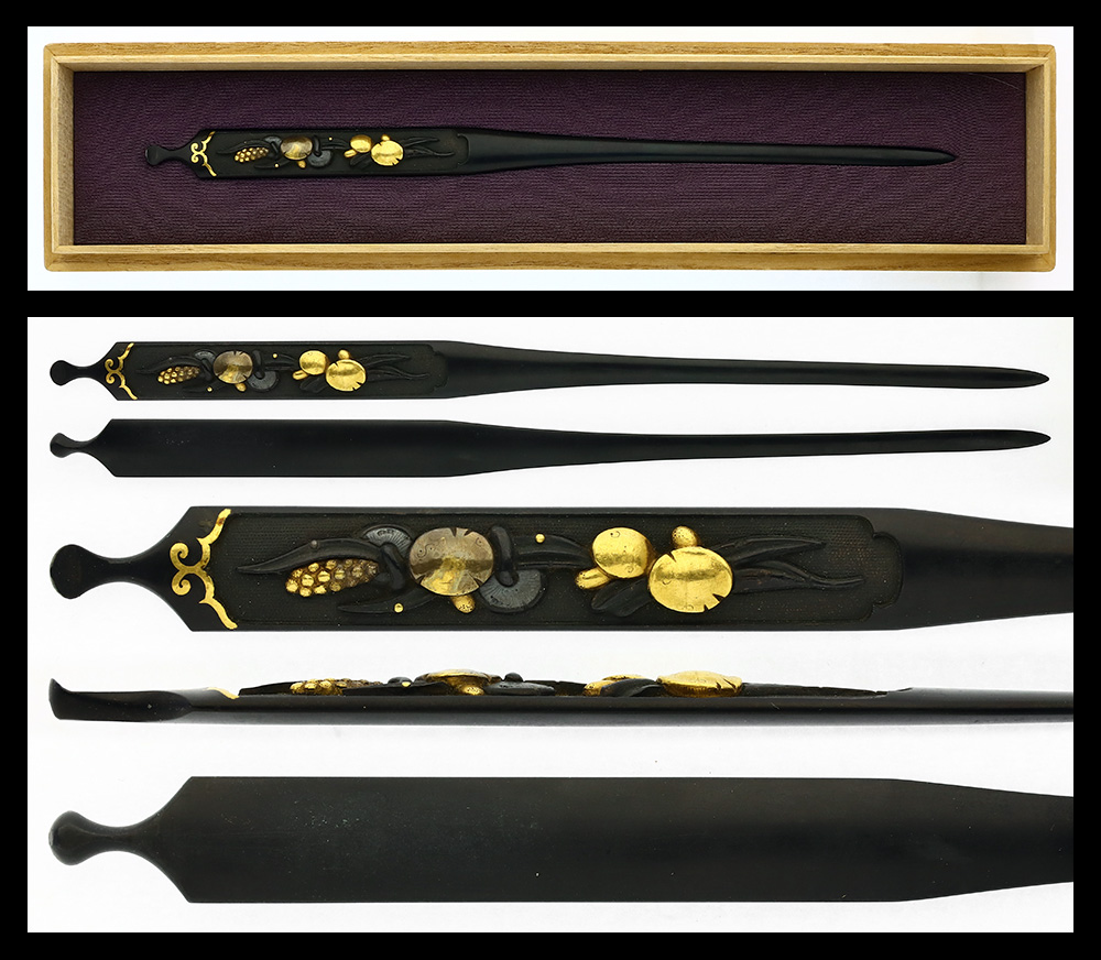 Features: The design of millet and mushroom is deeply carved on a shakudo nanako ground and highlighted with gold inlay.