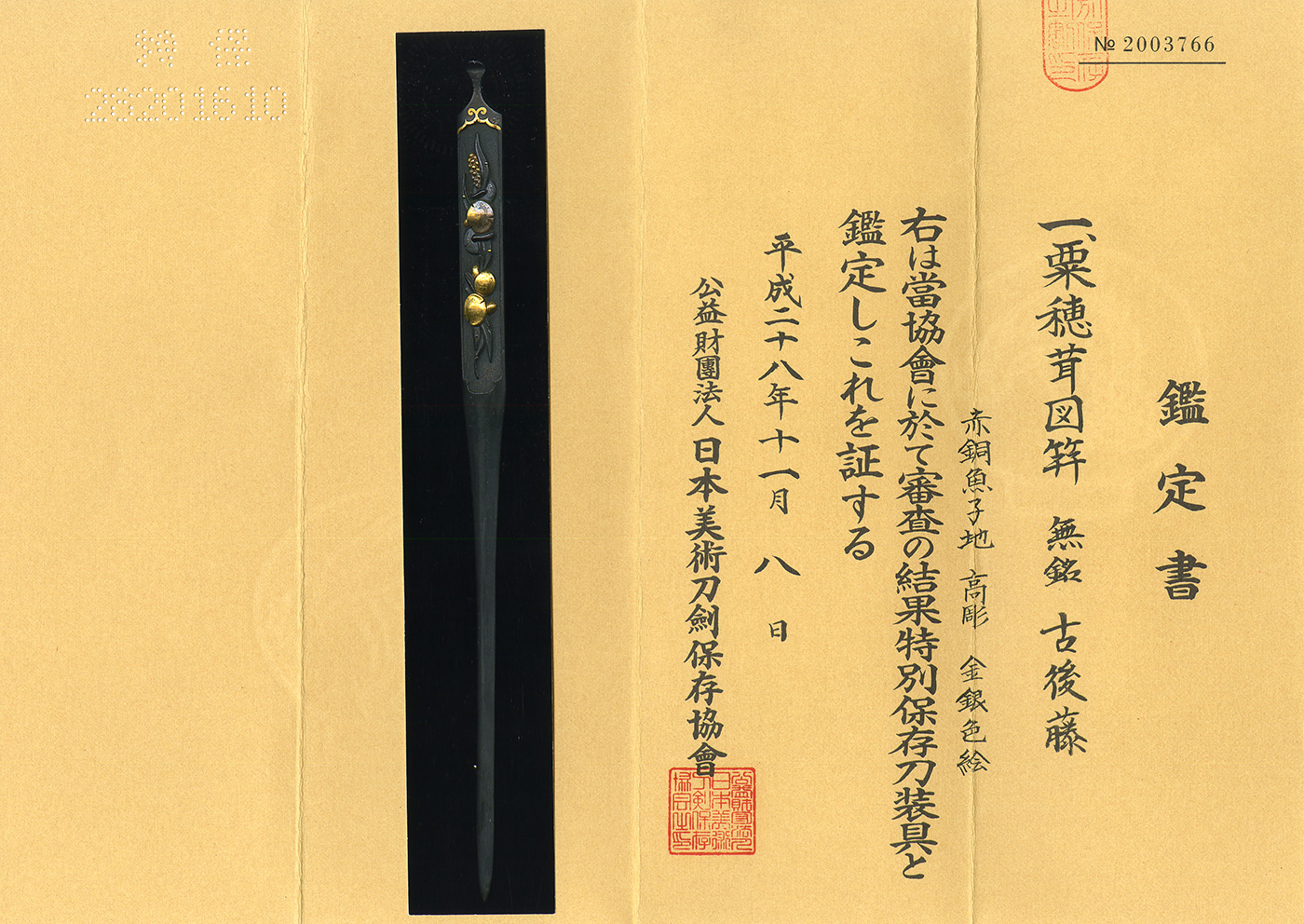 Kozuka: Awaho-Take (Millet and Mushroom) Design (NBTHK Tokubetsu Hozon Tosogu)